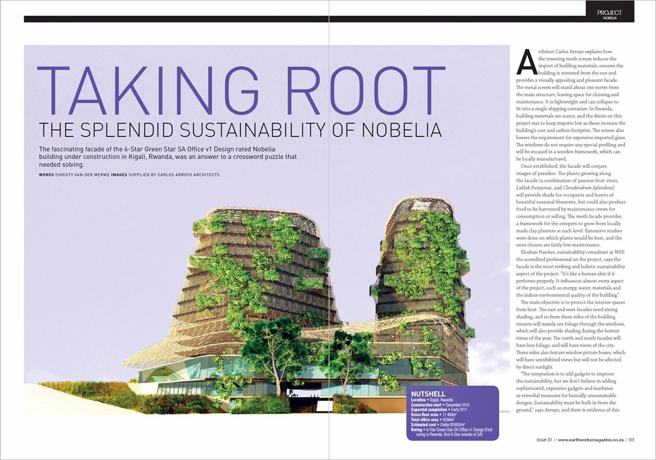 Buen artículo sobre Nobelia en la revista Sudafricana Earthworks, a propósito de la reciente certificación 6-Star GBC de nuestro proyecto. Arriba vemos las dos primeras páginas de la versión impresa, pero se puede leer el texto completo (sin imágenes) en la versión web con este enlace (en inglés).